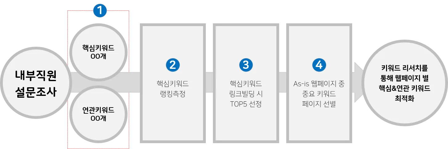 내부직원 설문조사를 통해 키워드를 전달 받고 구글/네이버 추천.관련 키워드를 통해 연관 키워드추가 한 후 핵심 키워드의 랭킹을 측정하여 링크빌딩 시 최우선 실행 TOP 5 키워드를 선정해서 중요 키워드 페이지를 선별 후 핵심&연관 키워드로 최적화를 실행을 합니다.