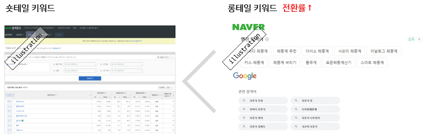 롱테일 키워드는 검색량은 낮지만 구체적이고 길게 구성된 키워드로, 전환율이 매우 높은 편입니다.
