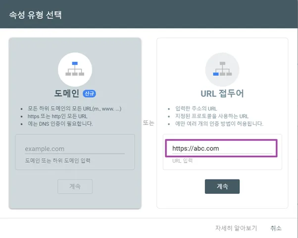 4. 속성 유형 선택이 나타나면URL 접두어 방식에서 내 사이트의 대표도메인을 입력하고, 계속을 클릭합니다.