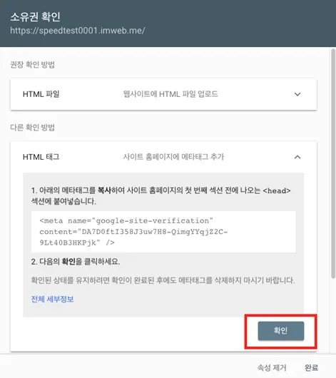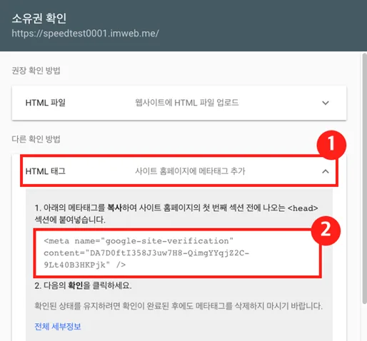 도메인 방식은 DNS 설정을 필요로 하지만, URL 접두어 방식은 간단하게 HTML 태그를 사용해 소유권을 확인할 수 있습니다.