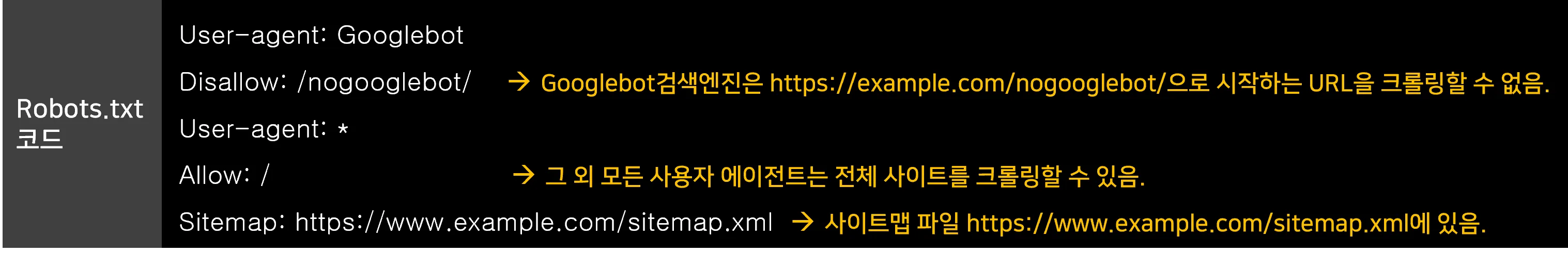 - 특정 디렉토리나 파일을 크롤링하지 않도록 지시할 수 있습니다.