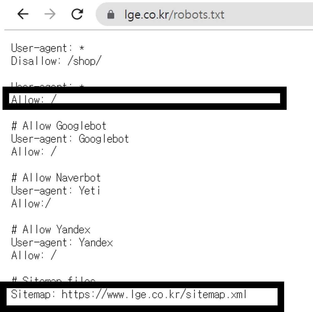 - Allow 및 Disallow 지시문을 사용하여 특정 경로나 파일을 크롤러에게 허용하거나 제한합니다.