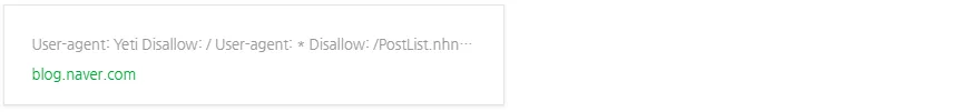 네이버 블로그는 구글에게 검색되지 않습니다. 이유는 네이버 블로그의 robots.txt에 하위 디렉토리를 다른 검색엔진이 와서 가져 가지 못하도록 정책 상 거부하기 때문입니다.